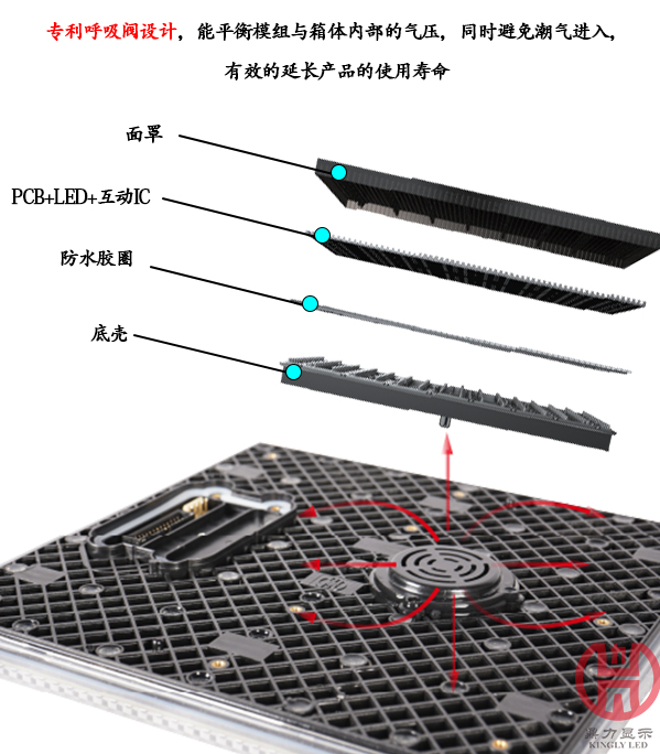 面罩跟底殼的結(jié)合處用防水膠圈壓合外,最后一道工序還要做密封灌膠處理,且模組的信號(hào)口也做了獨(dú)立的防水盒處理,帶有防水膠圈跟底殼壓合,比空位螺絲固定,灌膠;單個(gè)模組,可直接長(zhǎng)時(shí)間泡水,防水等級(jí)做到IP66,密封性強(qiáng),可靠性高。然而,受熱脹冷縮的影響,模組和箱體受熱容易膨脹,容易導(dǎo)致面罩和底殼變形,膠體破裂從而導(dǎo)致進(jìn)水,從而縮短屏體的使用壽命。